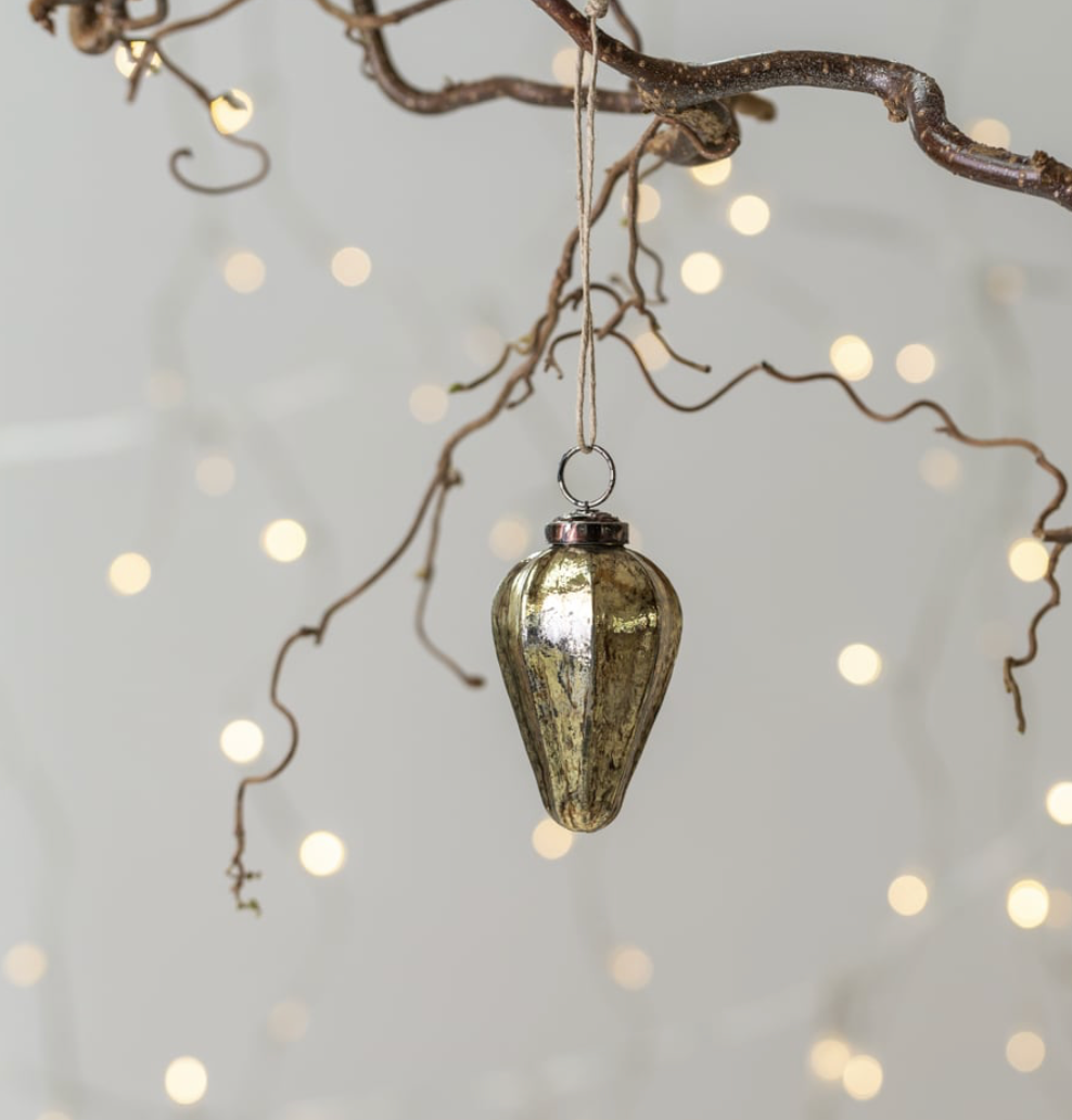 Spoil your Christmas tree with this distinctive gourd shaped glass bauble, which makes a perfect partner for our acorn bauble range, sharing the antiqued colourways of white, teal, silver and gold Dimensions: 3 × 3 × 7.5 cm