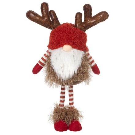 A traditional styled standing gonk decoration, featuring brown antlers, a red fuzzy hat and white & red striped legs and arms.
