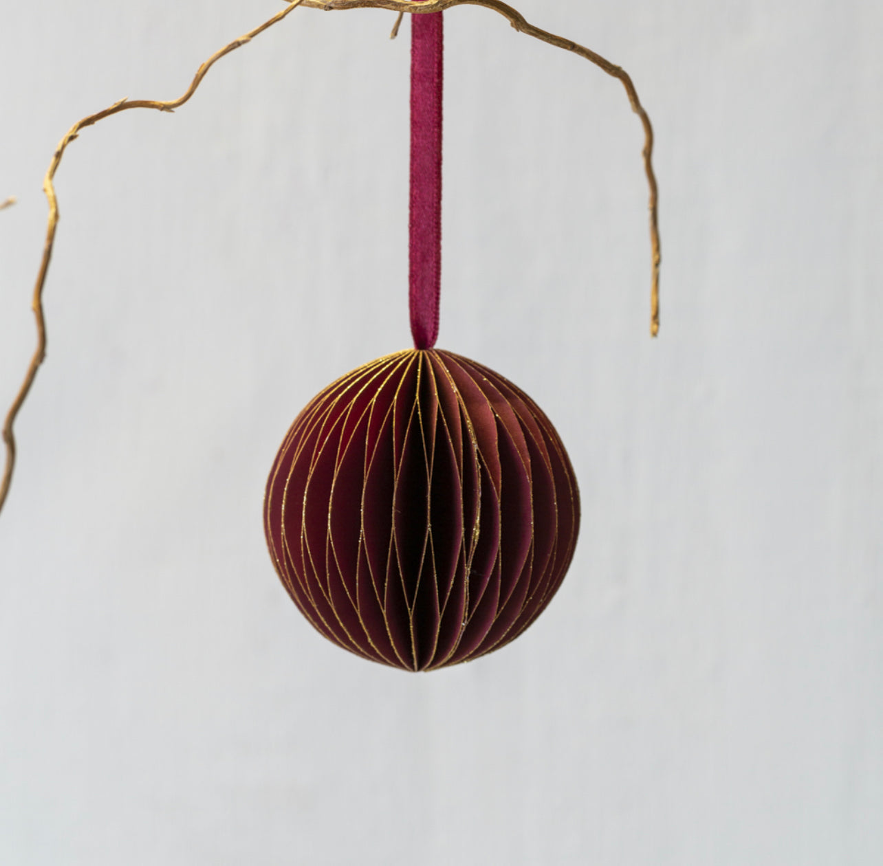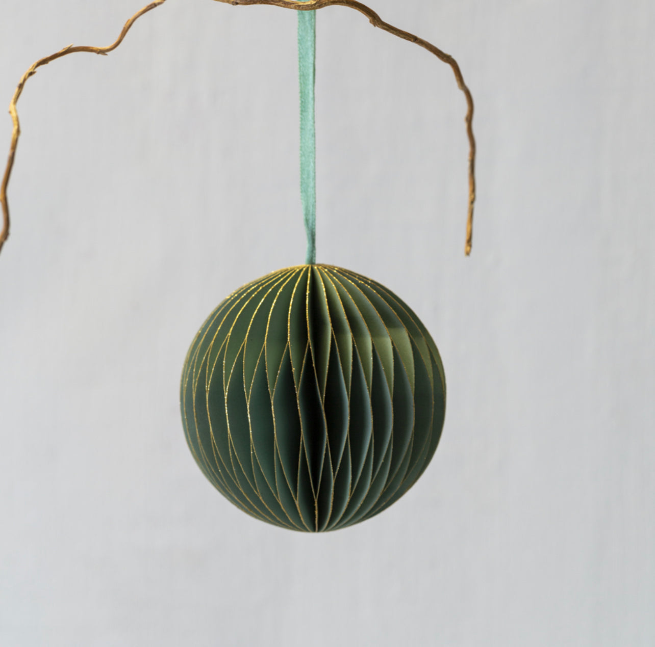 Presented in a recycled cardboard gift box, these pleated paper hanging decorations take a less than a second to unfold and secure with the hidden magnets. The subtle sparkle from the golden edges of these boule shaped decorations will catch the eye, whether hanging from a tree, a decorative branch or sitting in a bowl “en masse”. A multi coloured box of four colours, a perfect gift to spoil somebody. Made from recycled card and paper.