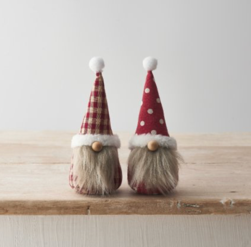An assortment of 2 patterned fabric gonks, each with fluffy beard and bead nose with either gingham or polka dot pattern